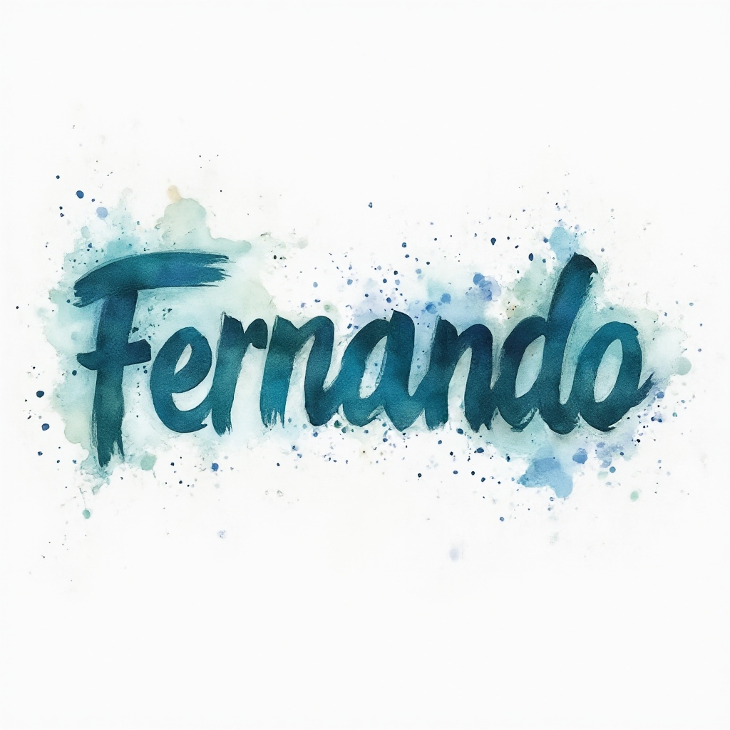 The name “fernando” painted as fluid watercolor lettering in layered blues and teals with splashes and drips on a white background.