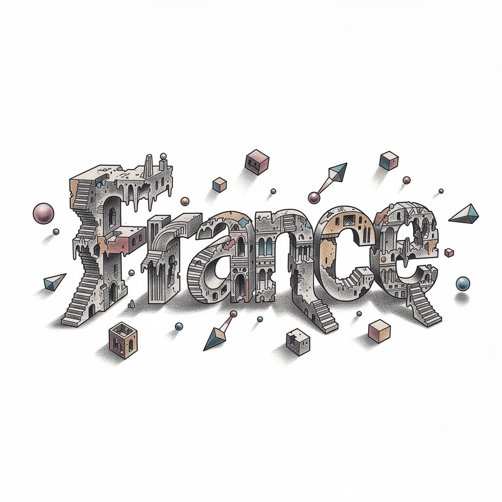 Surrealist tattoo design where the letters of France transform into dreamlike, impossible structures.