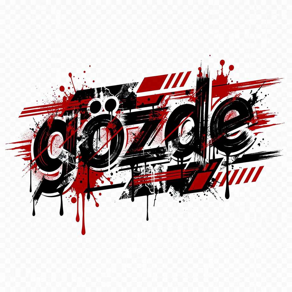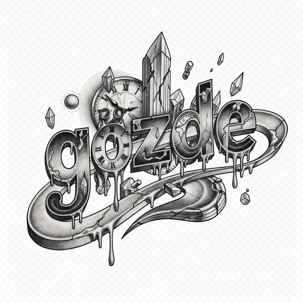 A surreal tattoo design where the name Gözde flows through strange, dreamlike shapes and abstract structures.