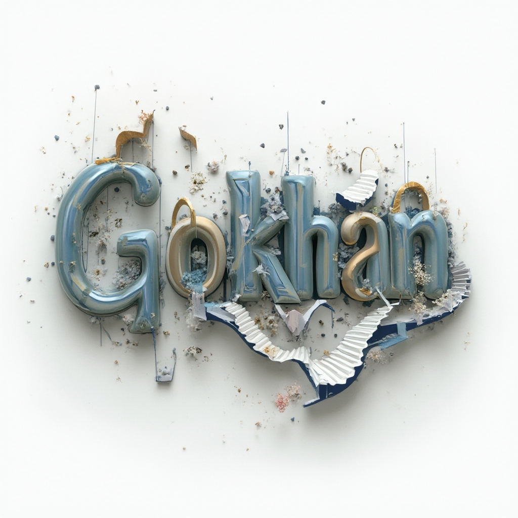 Dreamlike, three-dimensional surreal lettering of “gökhan,” twisting into impossible shapes with tiny architectural details.