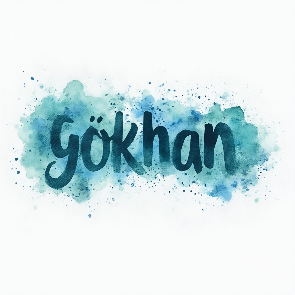 Fluid, brushstroke-style watercolor lettering of “gökhan” with splashes and drips in cool blue and teal tones.