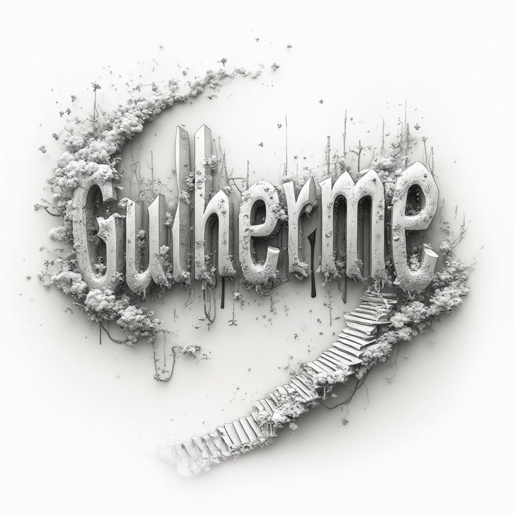 Surrealist tattoo concept where the name "guilherme" is built from impossible, gravity-defying forms and abstract architecture.
