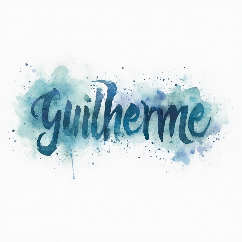 Expressive watercolor tattoo concept where the name "guilherme" is formed by fluid, hand-painted lettering, splashes, and soft gradients.