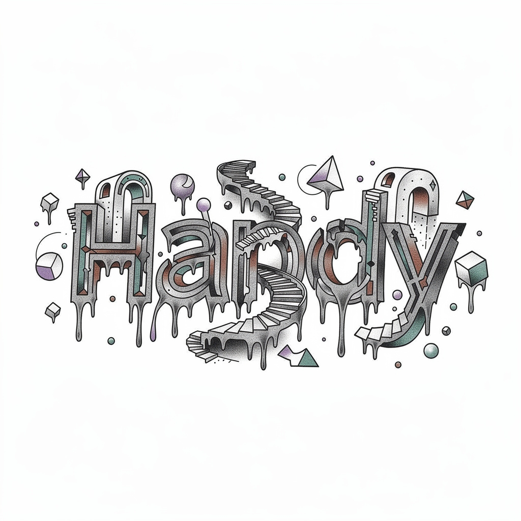 A surrealist tattoo design where the letters of Handy transform into strange architectural and dreamlike shapes.