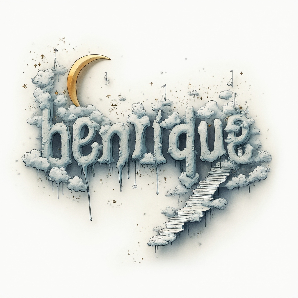 A surrealism-inspired tattoo design where “henrique” is built from twisted letters that morph into staircases, clouds, and impossible shapes floating on a white background.