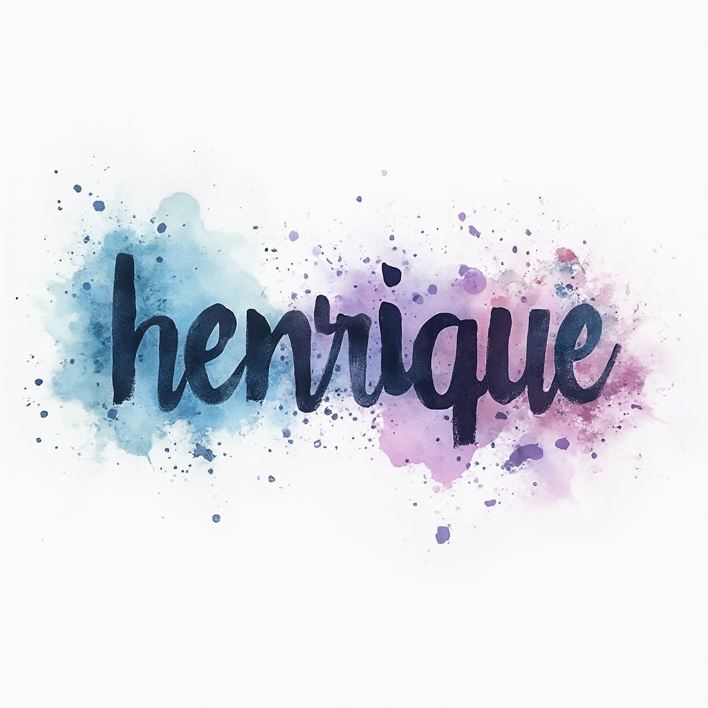 A vibrant watercolor tattoo concept where “henrique” is painted in fluid, brushstroke lettering that dissolves into splashes and gradients on a white background.