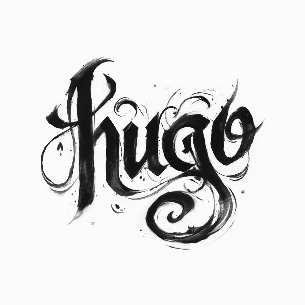 A surreal tattoo concept where the name “hugo” transforms into twisting, gravity-defying structures in empty space.