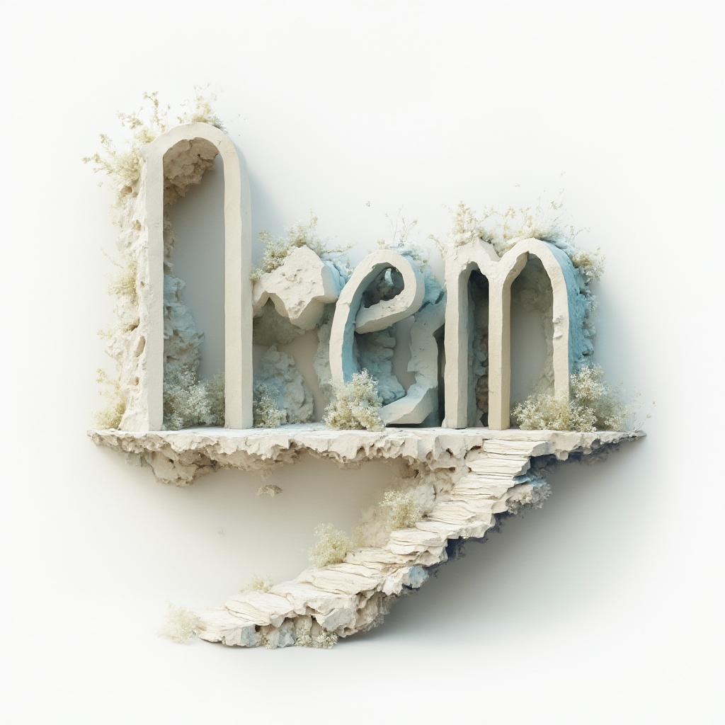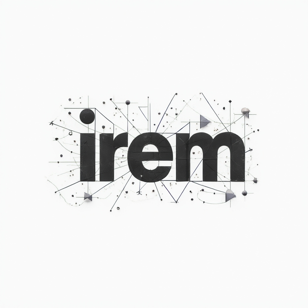 A surrealist ‘irem’ tattoo concept where the letters transform into impossible, floating architectural forms on a clean white background.