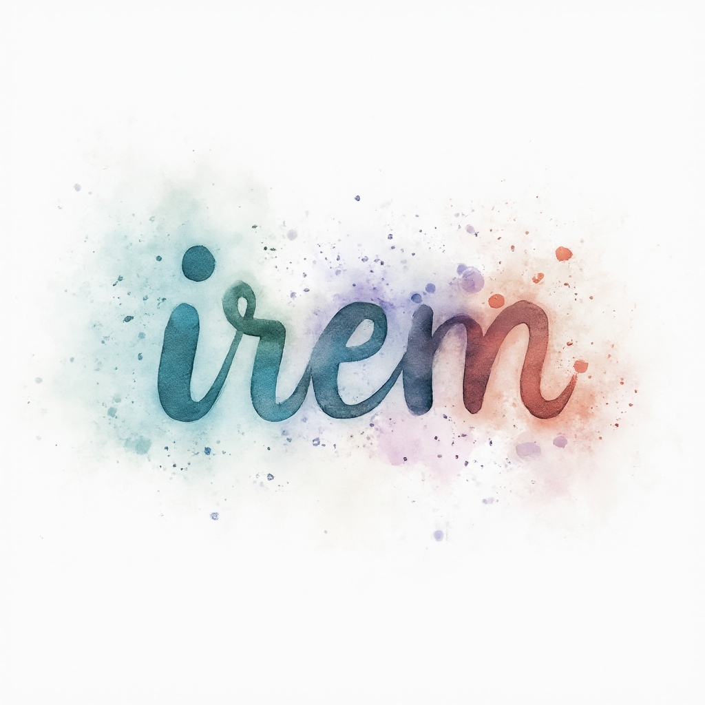 A delicate watercolor-style ‘irem’ tattoo concept with soft blended colors, splashes, and organic paint textures on a white background.
