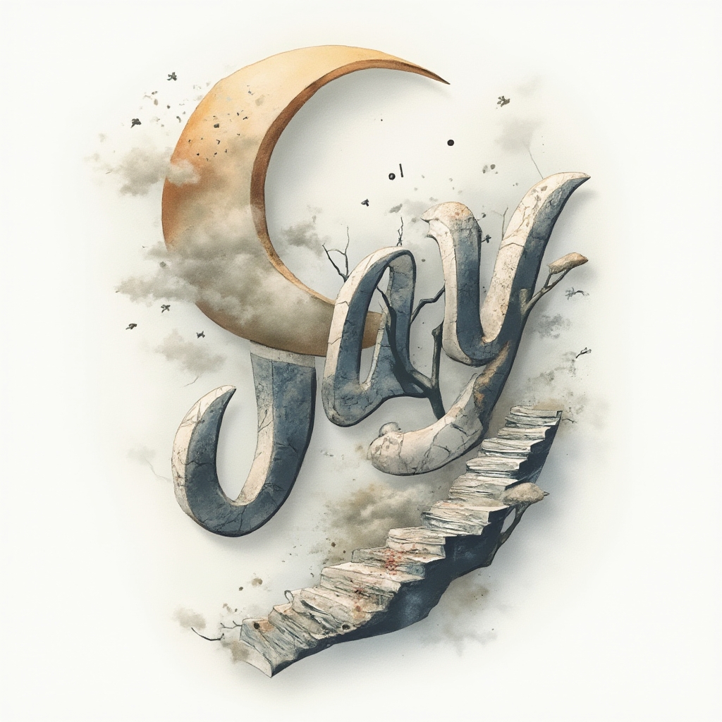 A surreal dreamscape tattoo concept where the letters of "jay" transform into impossible structures and organic shapes.