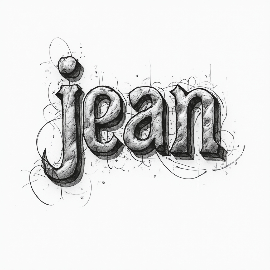A dreamlike surrealist tattoo concept where the name "jean" appears as floating, melting letterforms built from abstract shapes and ribbons on a stark white backdrop.