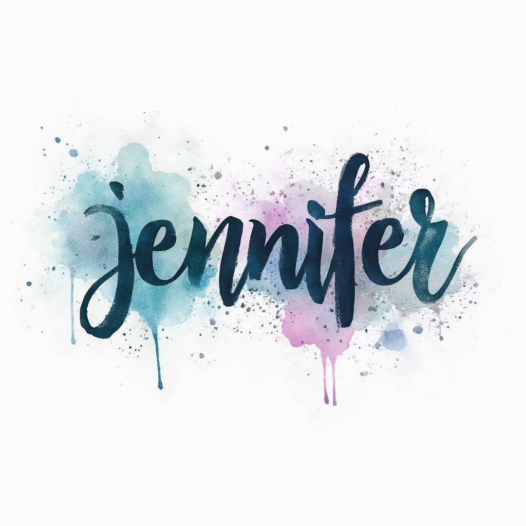 A soft, abstract watercolor tattoo design where 'jennifer' appears as flowing brushstroke lettering dissolving into colorful splashes.