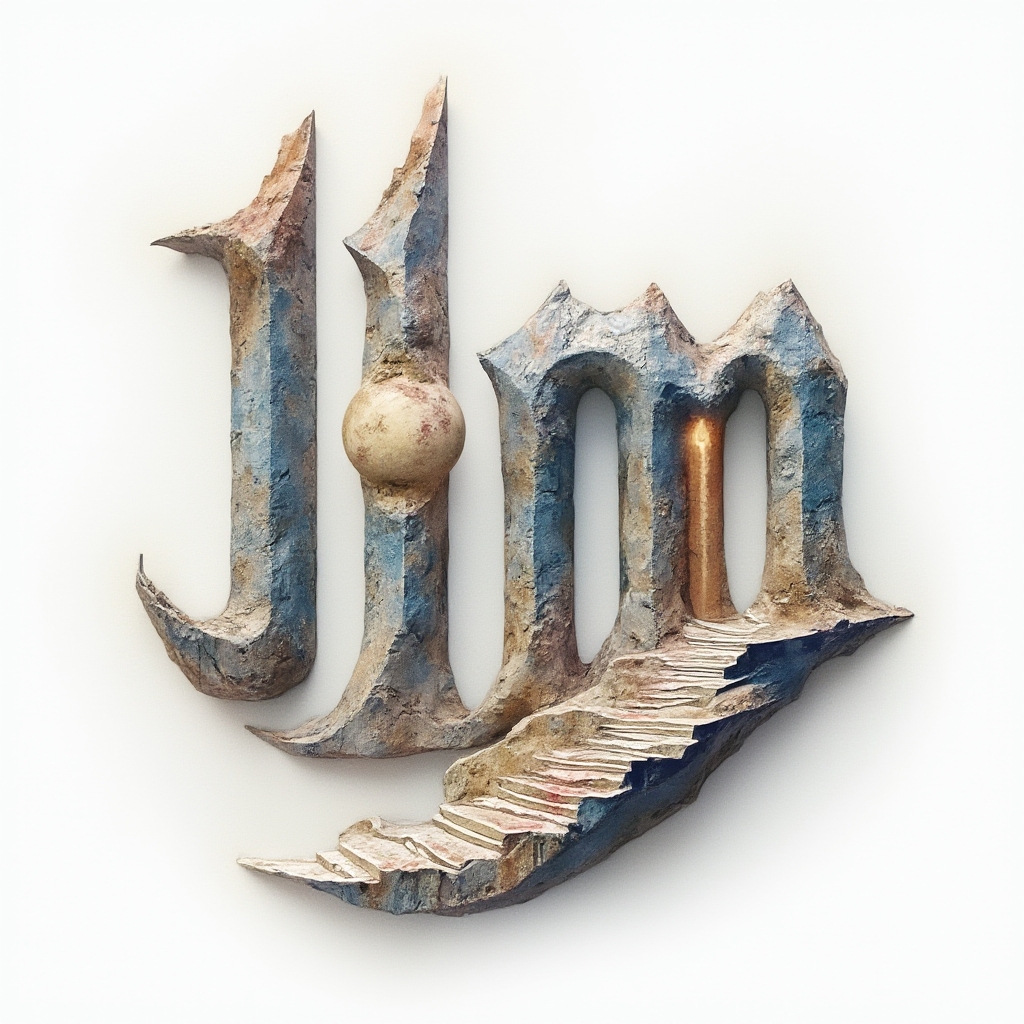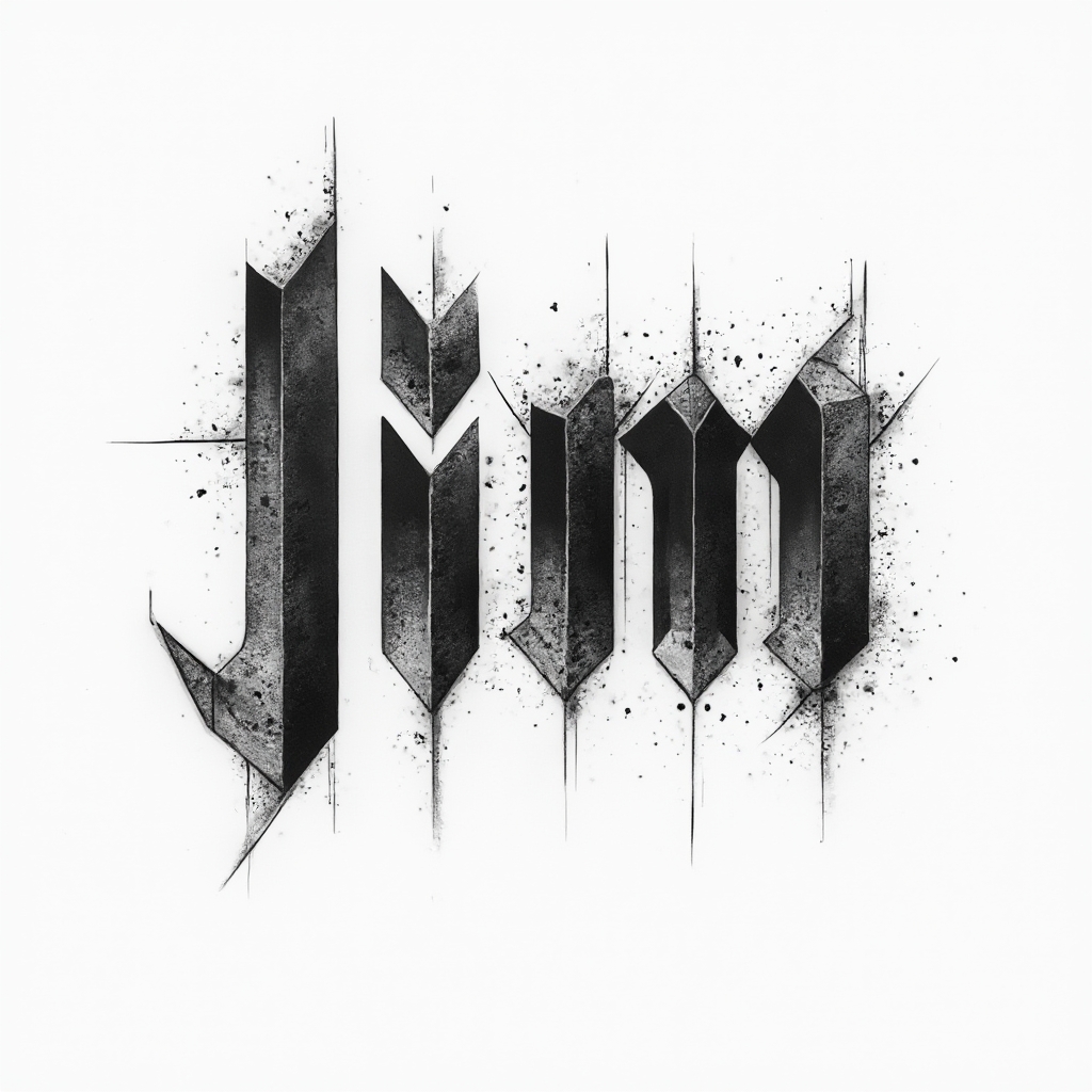 A surreal dreamscape where floating architecture and impossible structures weave together to spell the name "jim" in an imaginative tattoo concept.