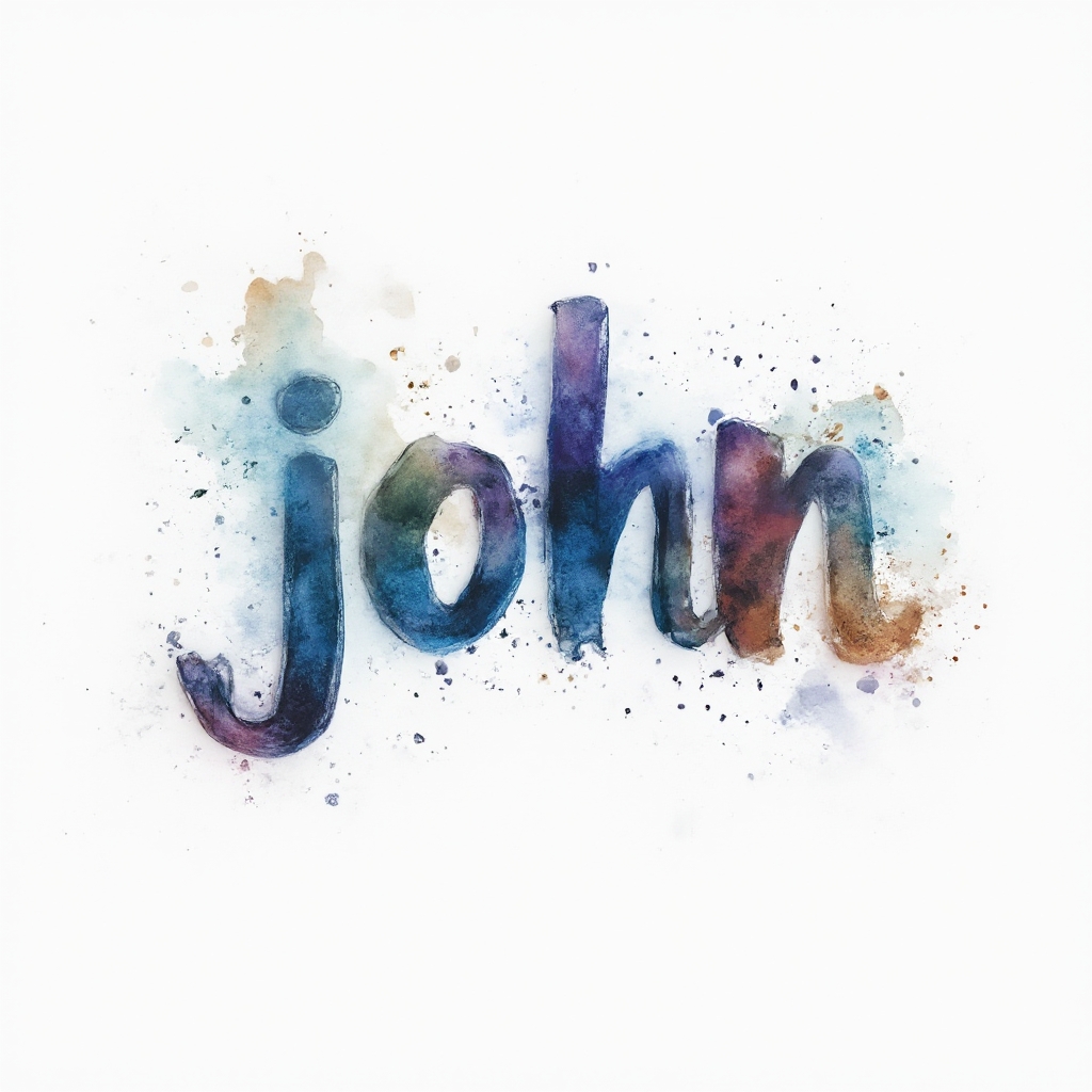Ethereal watercolor brushstrokes shape the name “john” into a flowing spectrum of blues, purples, and warm accents, surrounded by splashes and drips.