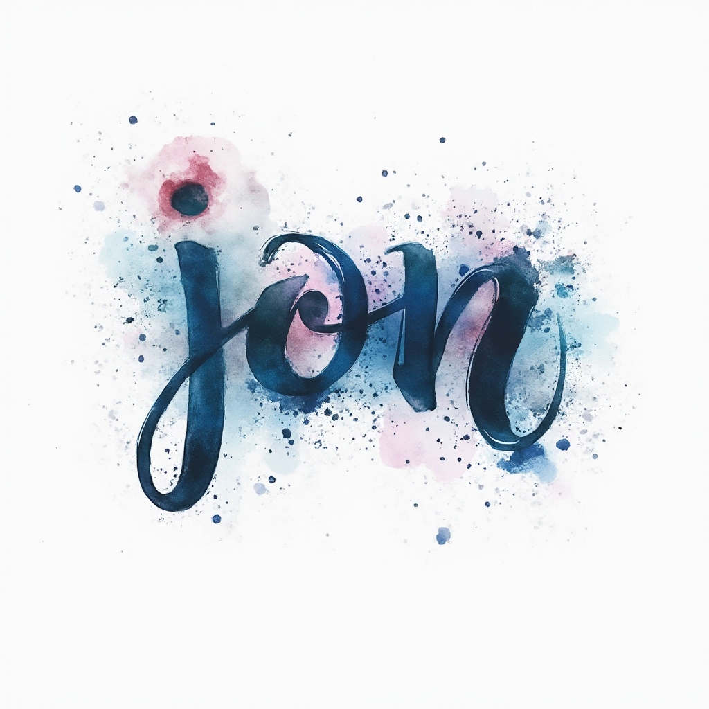 A fluid watercolor tattoo concept where ‘jon’ is shaped from flowing ink strokes and colorful splashes on a clean white background.
