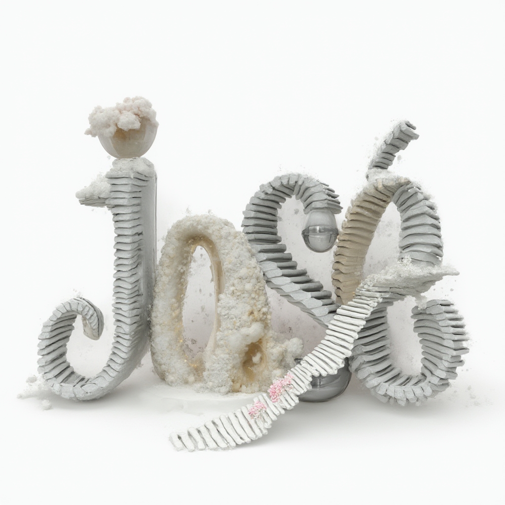 A surrealist interpretation of “josé” where each letter becomes an impossible object or tiny world, still reading clearly as the name on a white background.