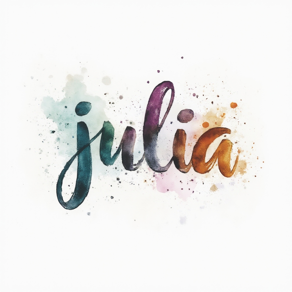 A light, fluid watercolor tattoo design where ‘julia’ emerges from colorful brushstrokes and splashes.