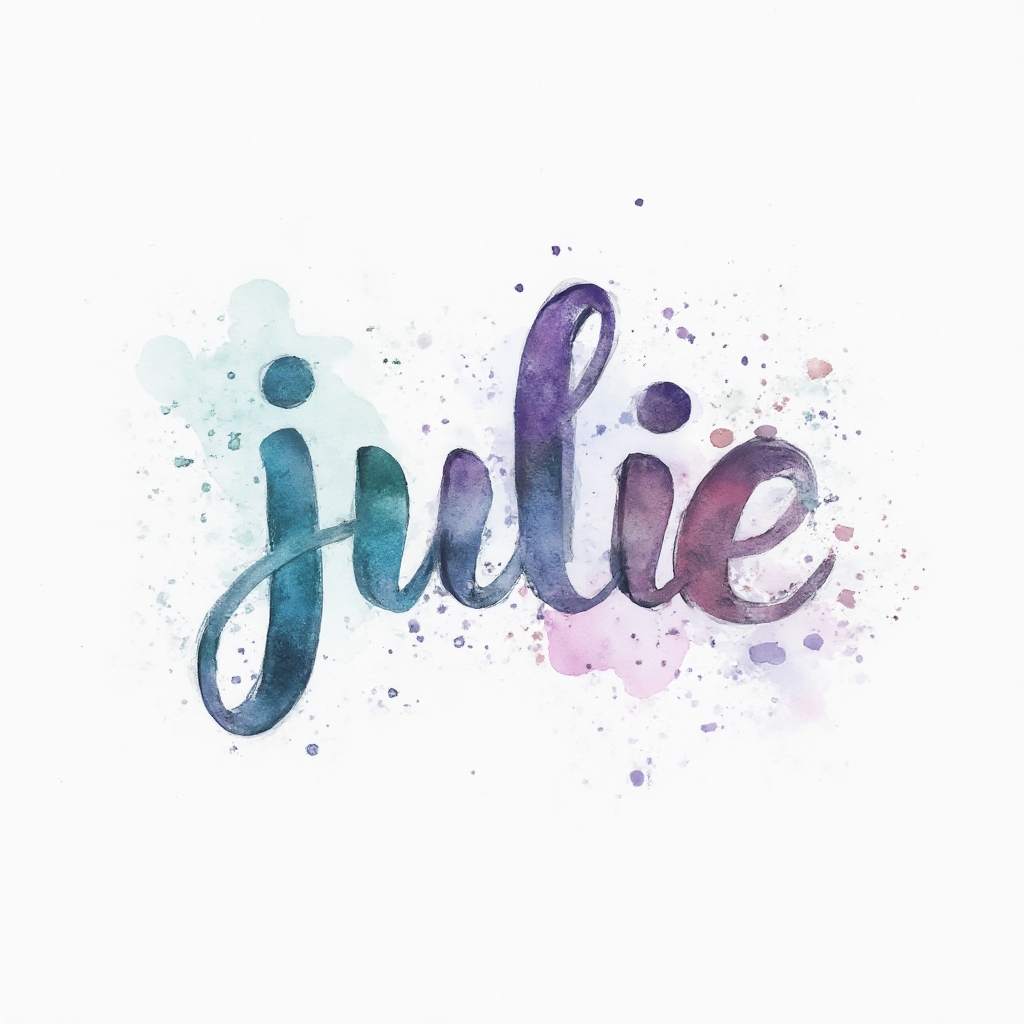 A dreamy watercolor interpretation of the name julie, painted in soft, flowing ink with pastel splashes on a clean white background.