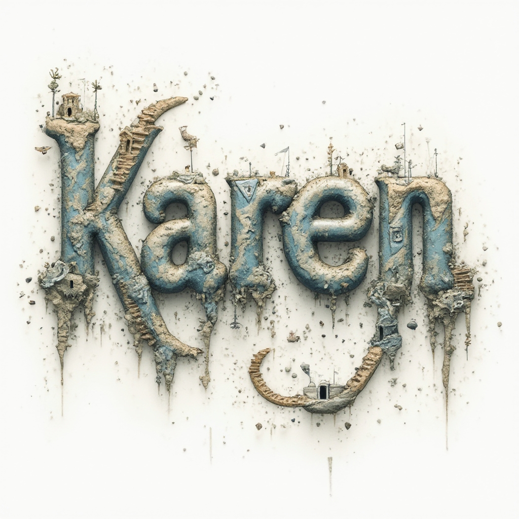 A surreal reimagining of “karen” as an impossible structure made from melting stone ribbons and dreamlike architectural fragments.