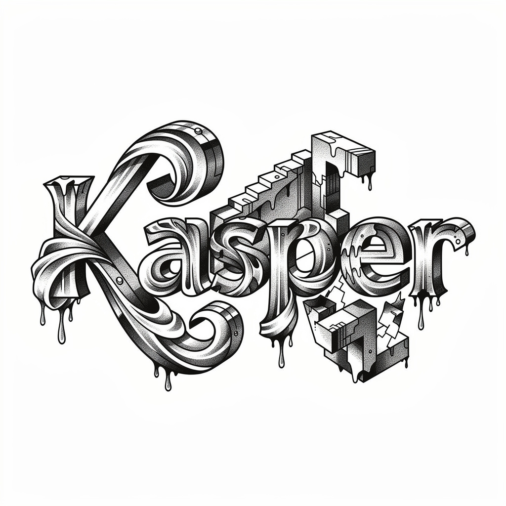 A dreamlike black-and-gray surreal tattoo idea, where the letters of Kasper twist into impossible, floating structures.