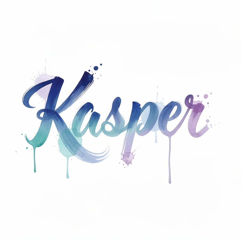 A soft, artistic watercolor tattoo concept where the name Kasper is painted as flowing strokes and color washes.