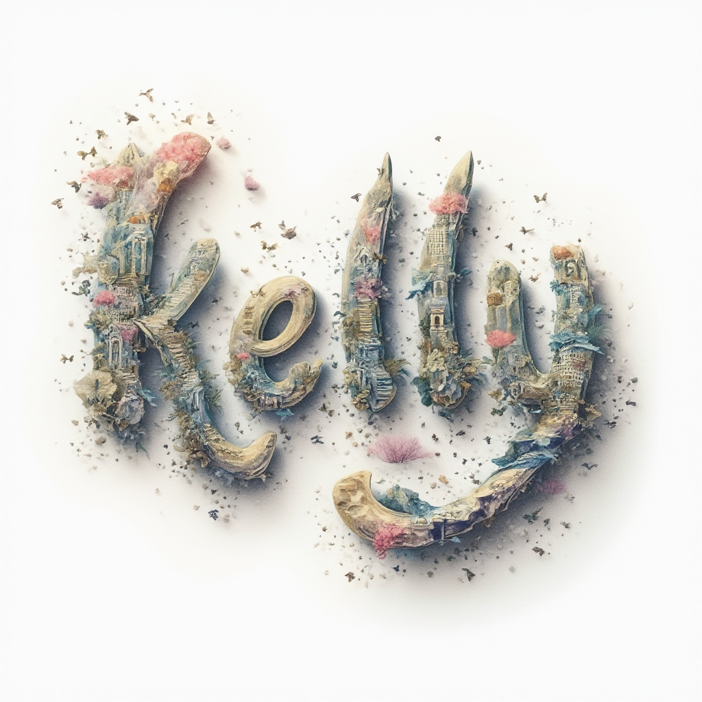 A surreal dreamscape where fantastical structures and liquid shapes weave together to spell 'kelly.'