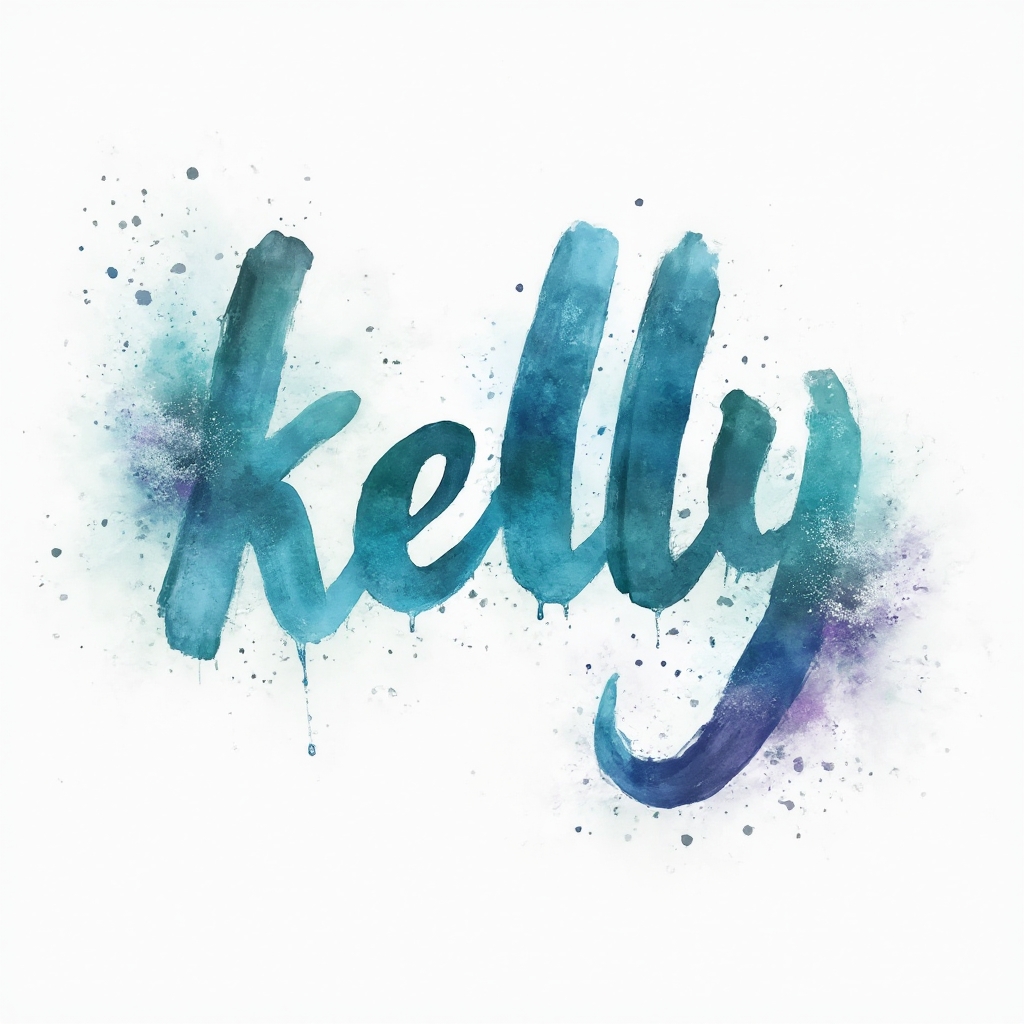 A flowing watercolor-style interpretation of 'kelly' painted as luminous brushstroke letters with splashes and drips.