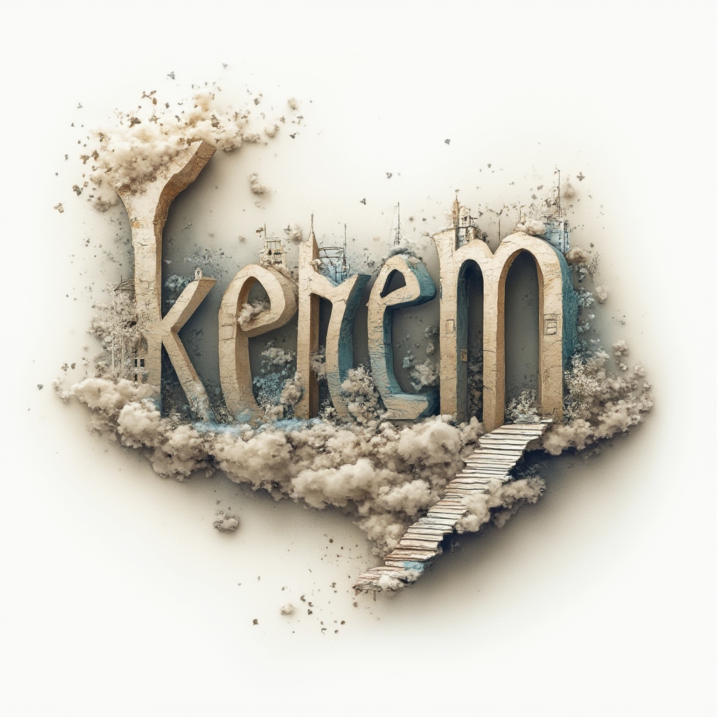 A surrealist dreamscape tattoo where ‘kerem’ transforms into impossible architectural and melting forms suspended in white space.