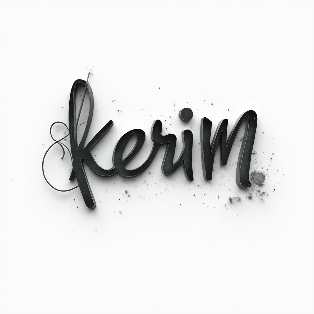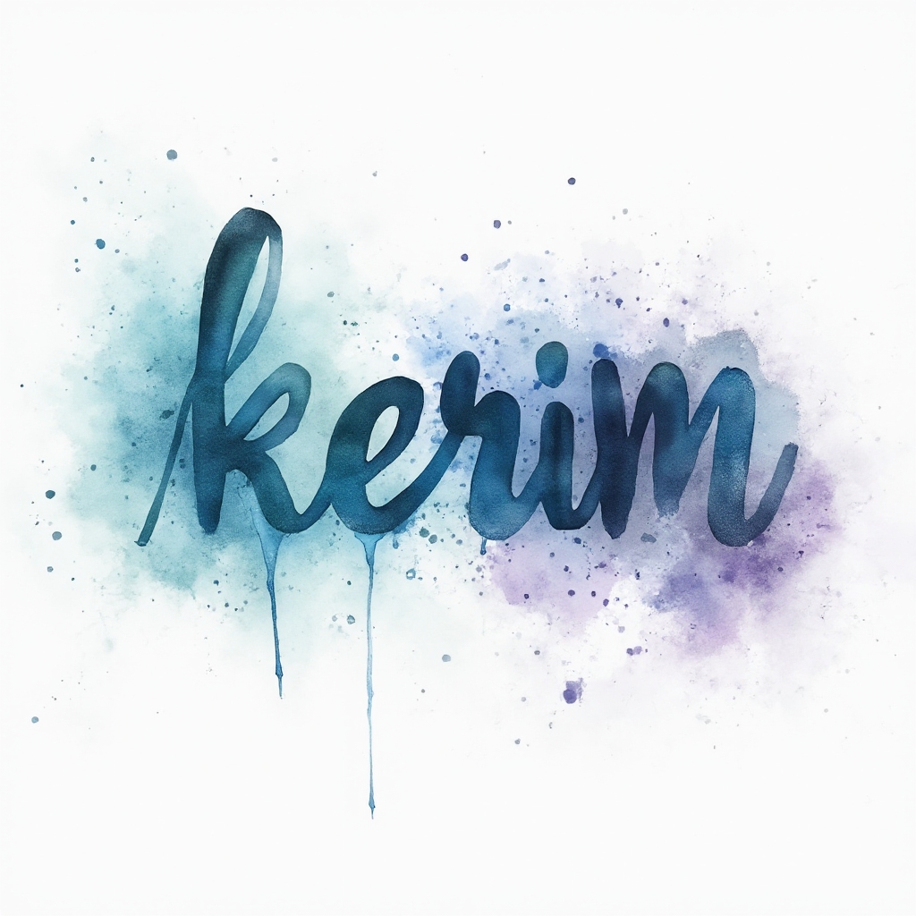 A fluid watercolor tattoo concept where ‘kerim’ is painted with flowing ink splashes and soft gradients on a pure white background.