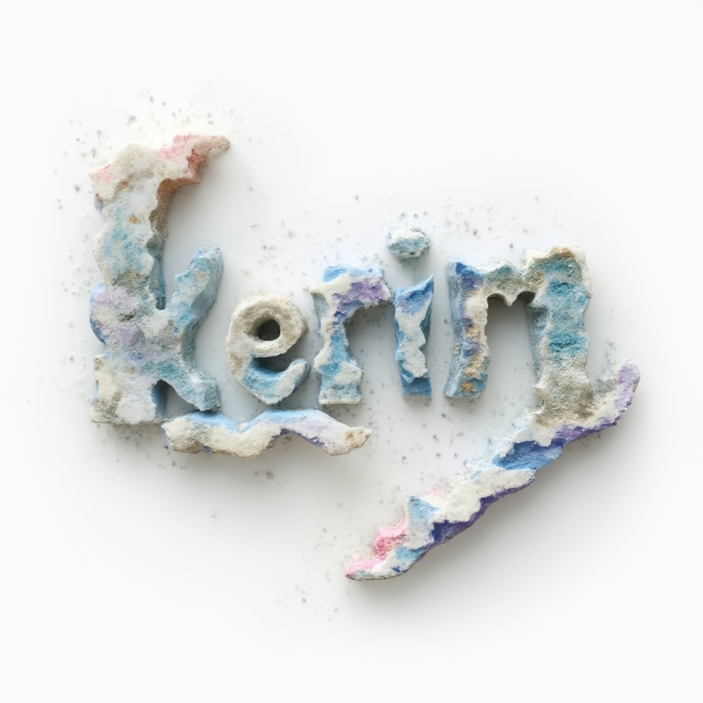 A surreal tattoo concept where ‘kerim’ turns into impossible ribbon letters that morph into floating stairs, clouds, and stone fragments on a white background.