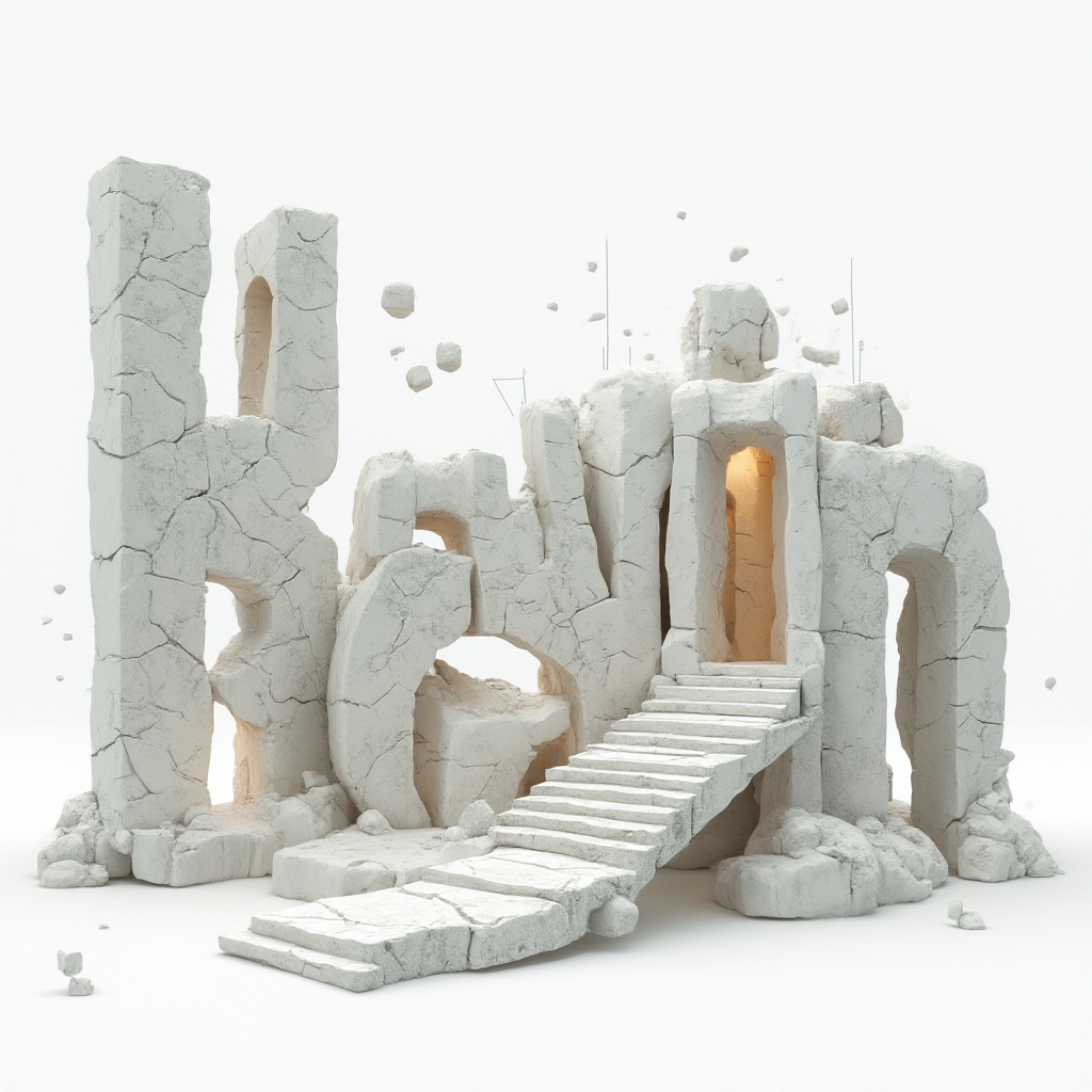 The name 'kevin' rendered as a surreal structure of floating stone, portals, and impossible shapes, cleanly isolated on white.