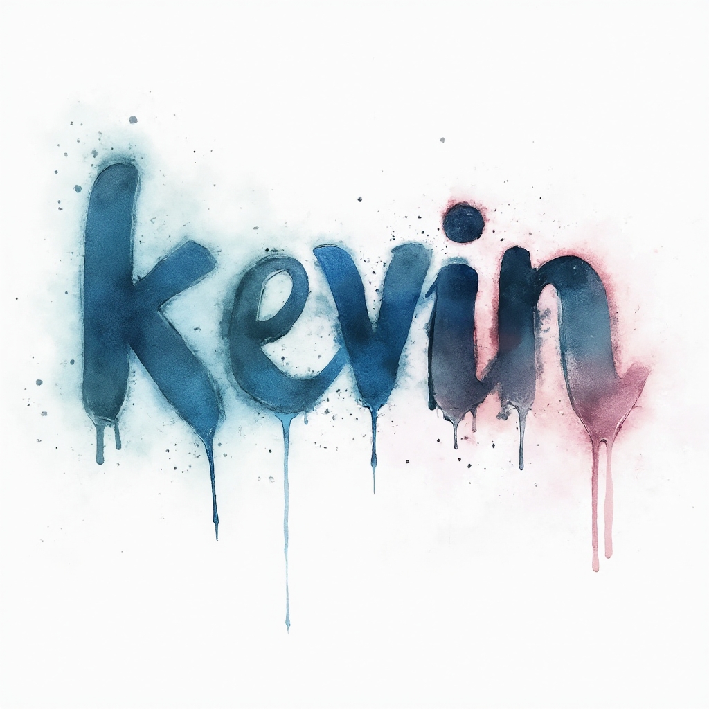 The name 'kevin' as flowing watercolor lettering, built from soft gradients, splashes, and drips on a clean white background.