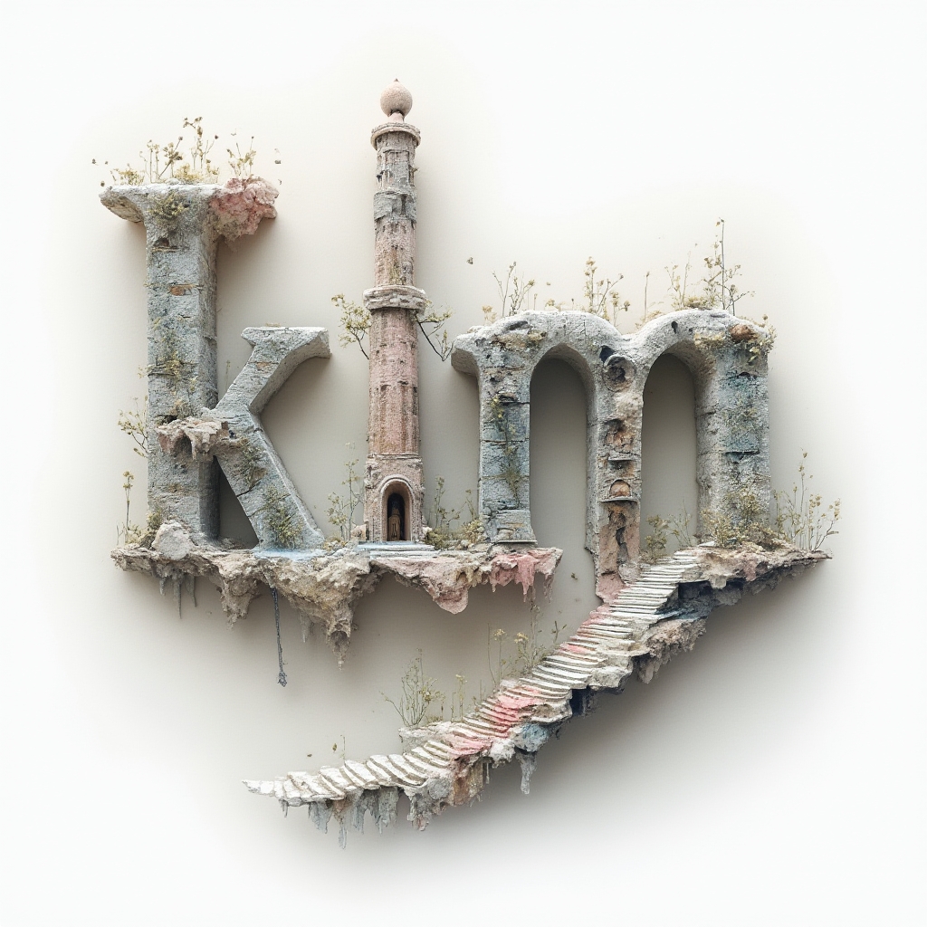 A surreal dreamscape-style lettering tattoo where the name “kim” is formed from impossible architectural structures.