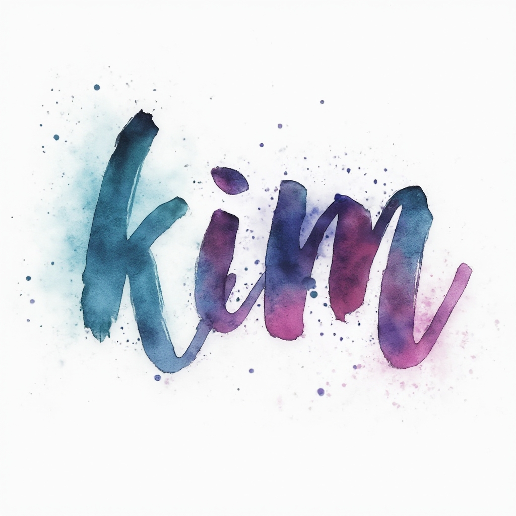 A vibrant watercolor splash interpretation of the name “kim,” painted as fluid, colorful calligraphy on white.