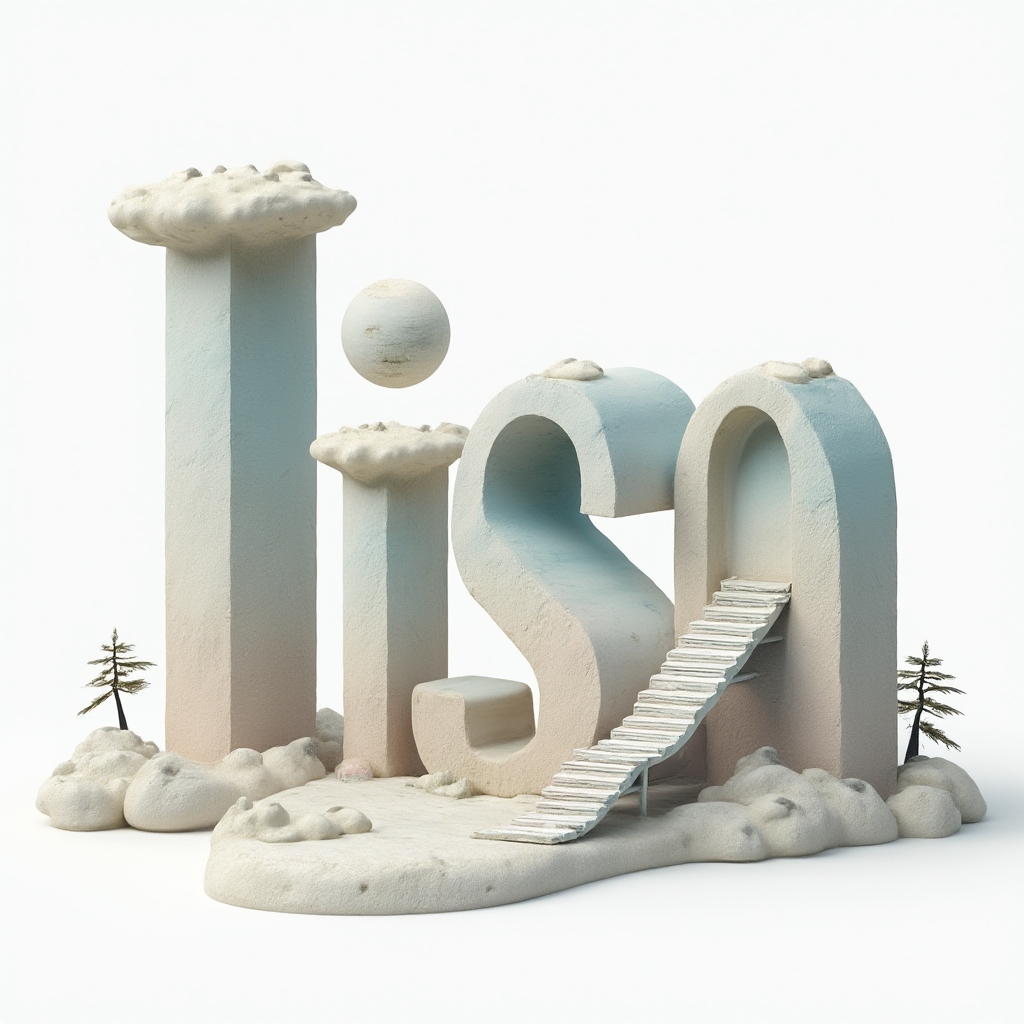 The name ‘lisa’ built from surreal, dreamlike letter-objects in an infinite white space, blending stone, water, clouds, and cosmic portals.