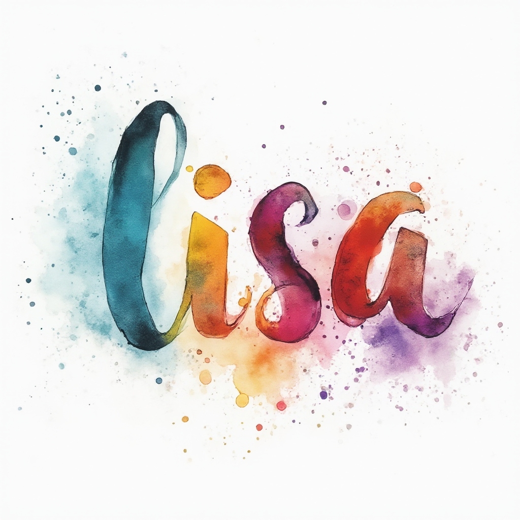 The name ‘lisa’ rendered as dreamy watercolor lettering built from splashes, gradients, and soft blooms of color on a white background.