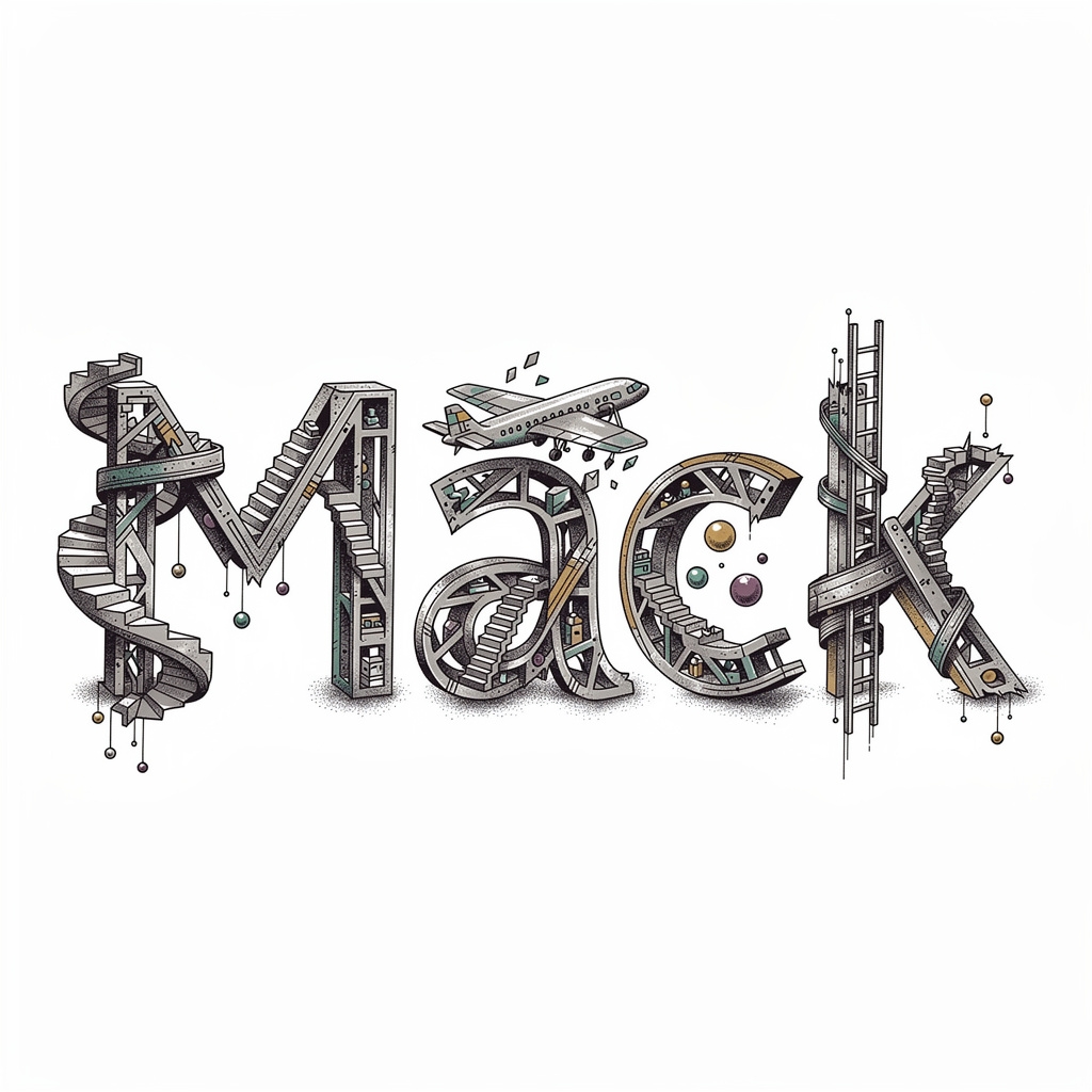 A surreal tattoo concept where the name Mack is woven into impossible structures and dreamlike forms for an imaginative, gallery-style design.