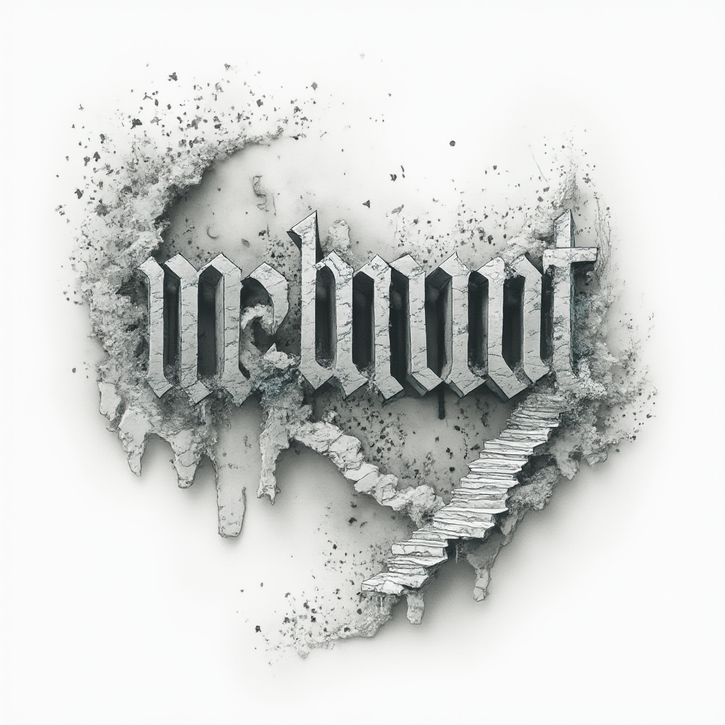 A surreal dreamscape tattoo where the letters of "mahmut" become impossible structures, stairs, and windows into tiny worlds.