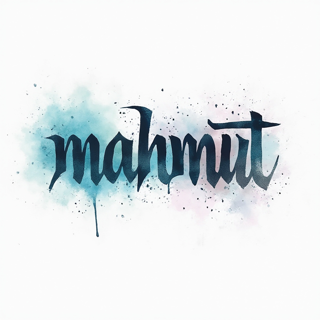 A fluid watercolor tattoo concept where "mahmut" melts into vibrant splashes and soft gradients on a white background.