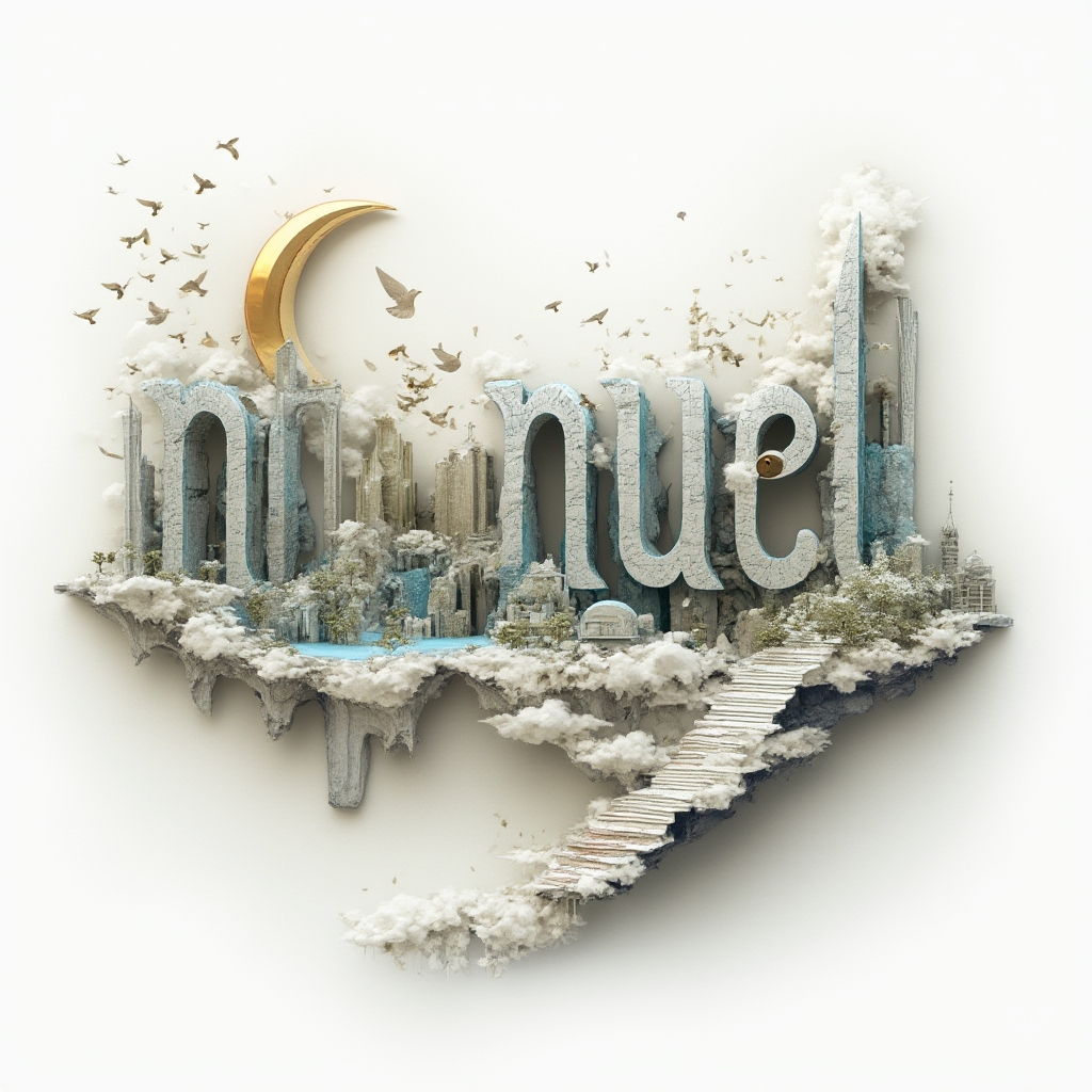 A surreal dreamscape tattoo concept where Manuel becomes floating architecture, clouds, and impossible forms woven into stylized lettering.