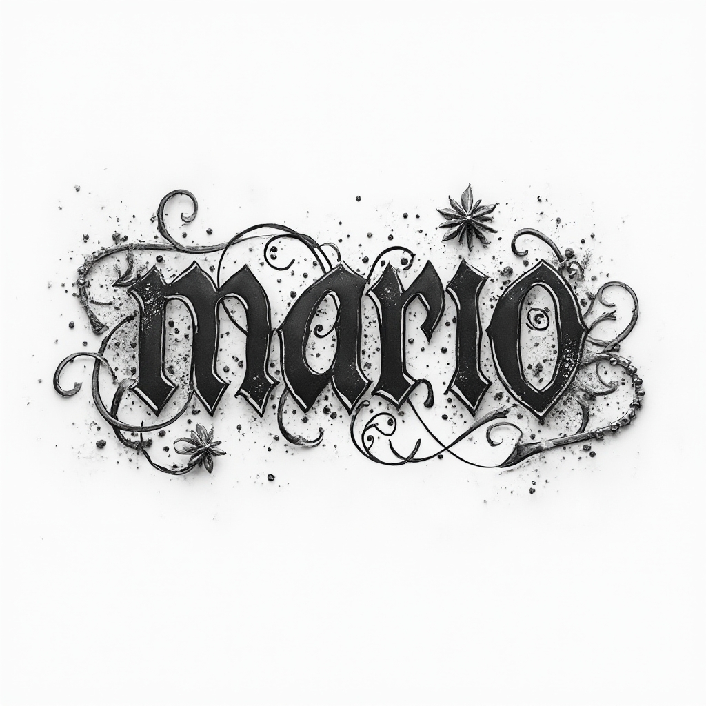 A surreal tattoo design where the name mario appears as impossible, dreamlike letter-forms built from floating fragments and bending shapes.