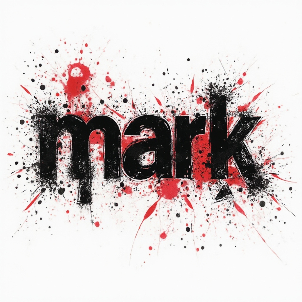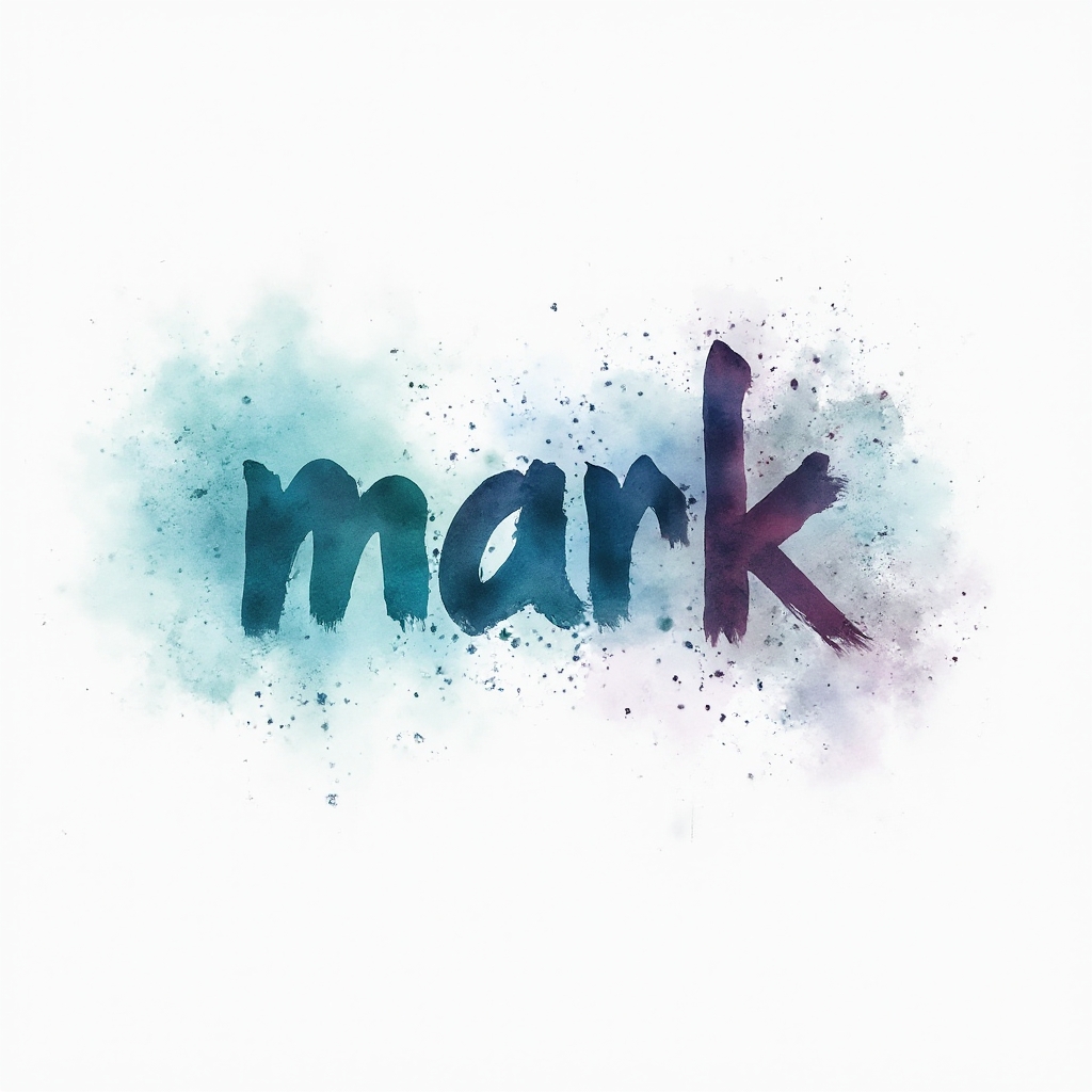 A fluid watercolor design where 'mark' is painted in soft, bleeding hues with splashes and clouds of color.