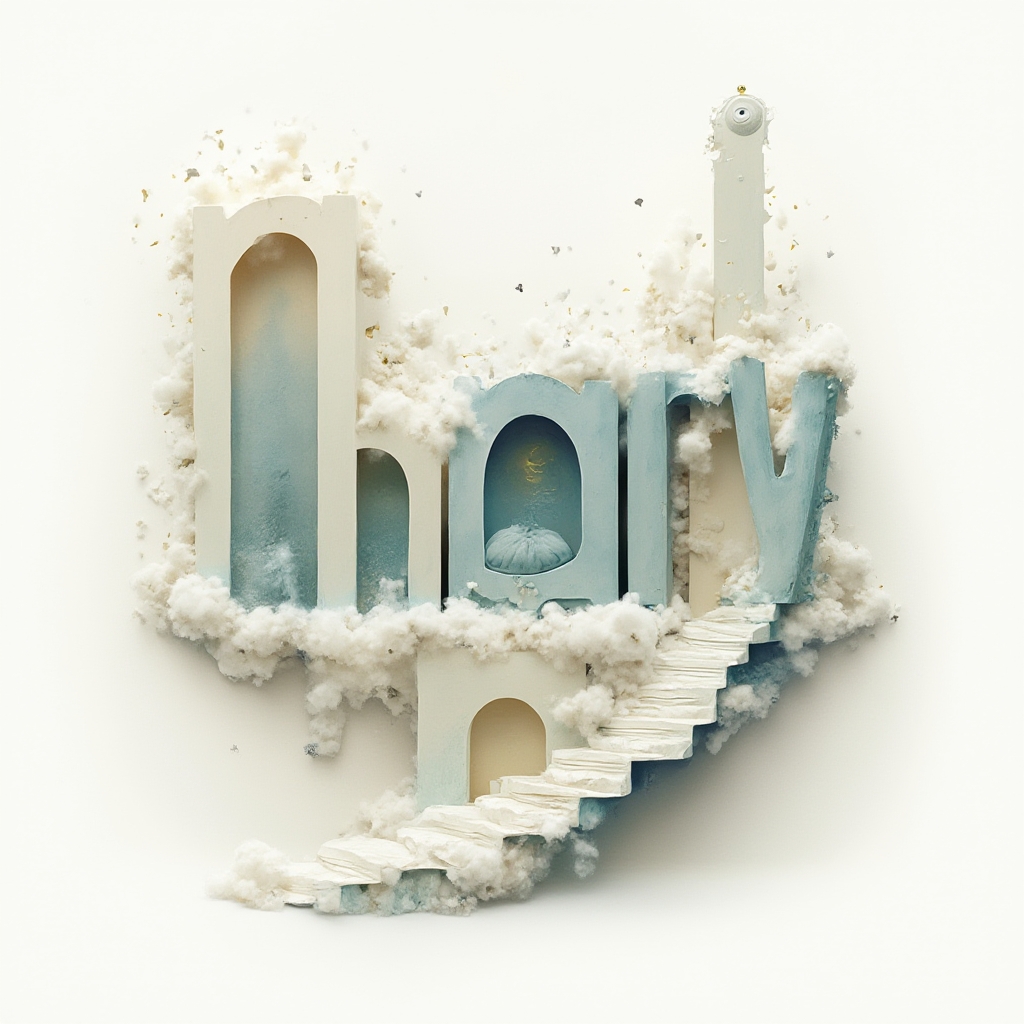 A dreamlike surreal composition where the letters of “mary” become floating stairs, portals, melting forms, and celestial details.