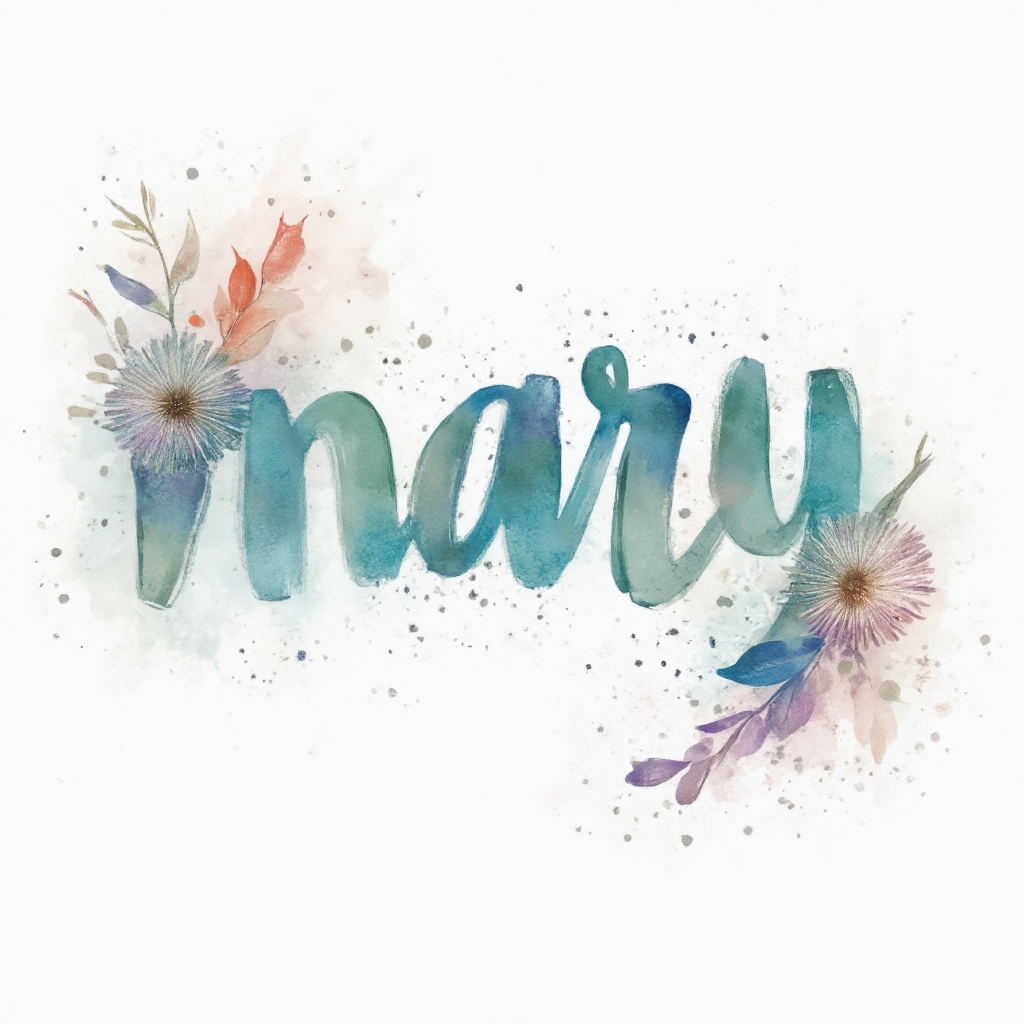 Flowing watercolor brushstroke lettering of “mary” dissolving into dreamy pastel splashes and floral accents.