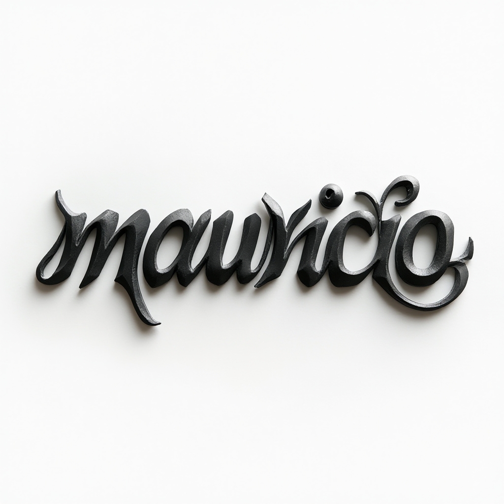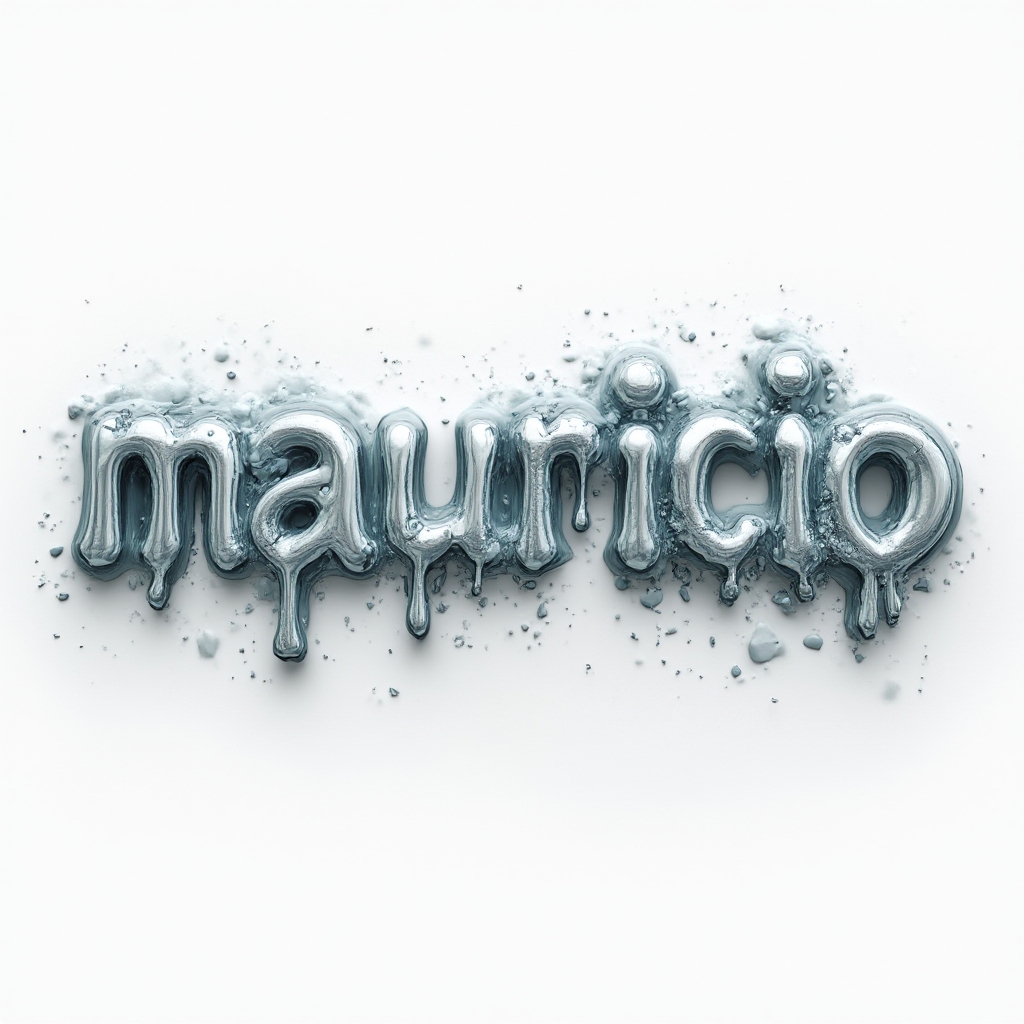 A dreamy surrealist lettering concept where "mauricio" appears as melting chrome and glass-like forms drifting in empty white space.