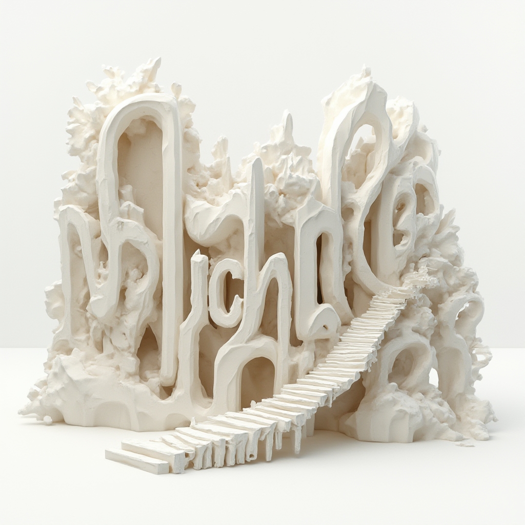 A surrealism-inspired tattoo concept where michele appears as dreamlike, impossible architectural letterforms floating in a white void.