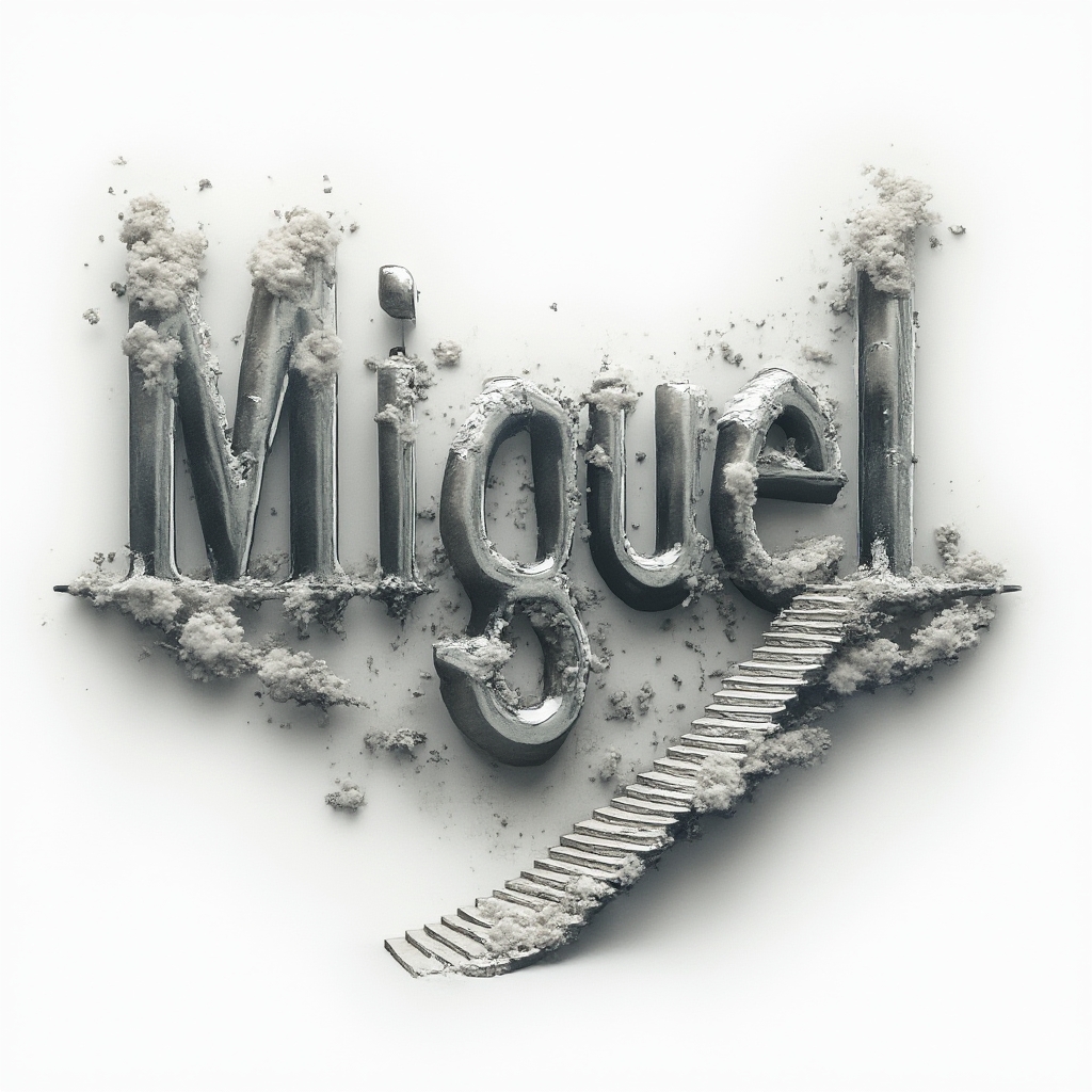 The name “miguel” transformed into a surreal dreamscape of melting, floating architectural letterforms on a white background.