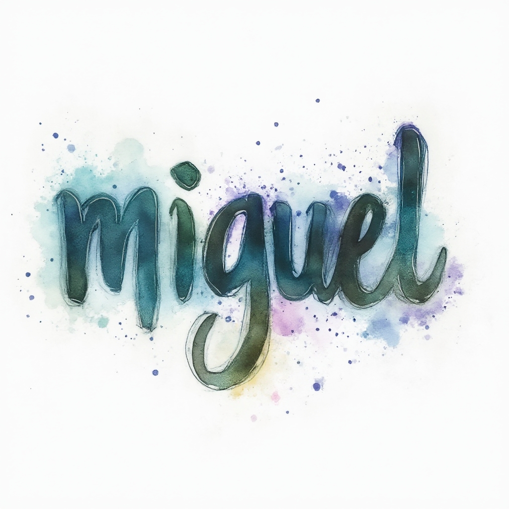 The name “miguel” rendered as soft, flowing watercolor calligraphy, surrounded by colorful splashes and gradients on a white background.