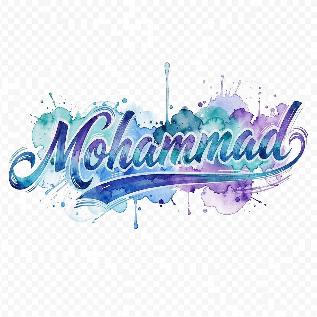 A soft, fluid watercolor tattoo composition where the name Mohammad is painted in expressive, colorful brushstroke lettering.