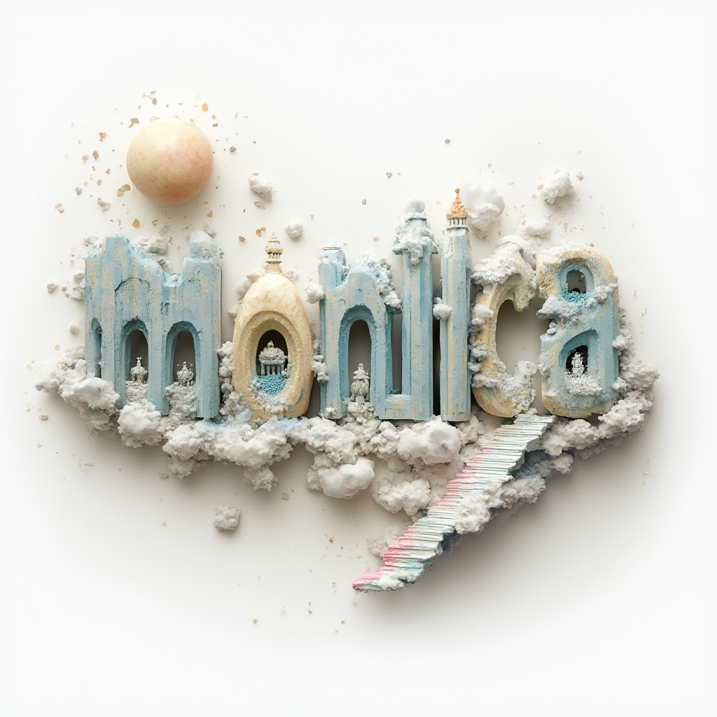 A surrealist design where Monica’s name becomes floating, dreamlike architecture and forms in a soft, otherworldly palette.